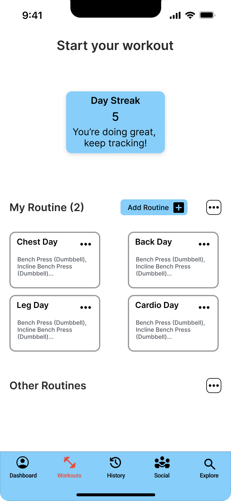 Before deciding on design features, I revisited my research goals and formed hypotheses to pinpoint issues, helping prioritize features within the constraints of time and budget. Understanding my target audience—Users who want to be physically active, and users who want to be physically active—was crucial. Based on this, I focused on creating a user experience that allows beginners to begin their fitness journey and as well as help experienced people find easier ways to track their fitness progress. These changes aim to improve the accessibility of tracking fitness progression and as well assist beginners in starting their fitness journey with a variety of informational resources and social features for accountability and consistency.