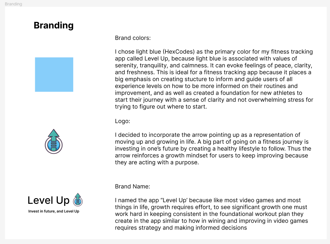 In conclusion, the aim was to empower users through efficient workout tracking, fostering precision, consistency, and discipline. Competitive analysis of fitness apps like My Fitness Pal and Strong revealed varying approaches to tracking, catering to both beginners and experienced users. User interviews highlighted the need for structured progress tracking, clarity on tracked aspects, and accountability. Affinity mapping synthesized these insights, guiding the development of a tailored fitness app. Key elements of the design process included low and high-fidelity wireframes, branding the app as "Level Up" to signify growth and purpose, and selecting a light blue color palette for its inclusive and harmonious connotations. The logo featured an upward arrow symbolizing progress. Testing played a crucial role, with Usability Test 1 revealing color contrast issues that were addressed in subsequent revisions. Insights from testing refined the design, ensuring improved usability and user satisfaction. This project illuminated the importance of tailored fitness solutions, informed by user insights and refined through iterative testing. It underscores the significance of inclusivity, clarity, and accountability in fitness tracking apps, laying a solid foundation for future endeavors in user-centric design.