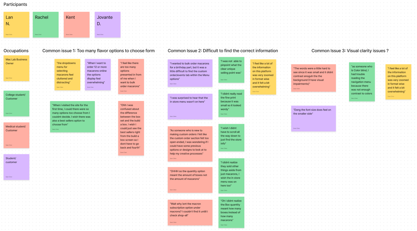 To delve deeper into website issues, I conducted usability tests focusing on key features highlighted by the owners, such as accessibility, product navigation, and the popular "Build-A-Box" feature. Participants were tasked with locating crucial information like merchandise and macaron flavors while navigating the ordering process. Their feedback revealed common issues: overwhelming choices in the "Build-A-Box" feature, difficulty finding desired information (relevant info placed in irrelevant places), and visual clarity issues impacting accessibility.